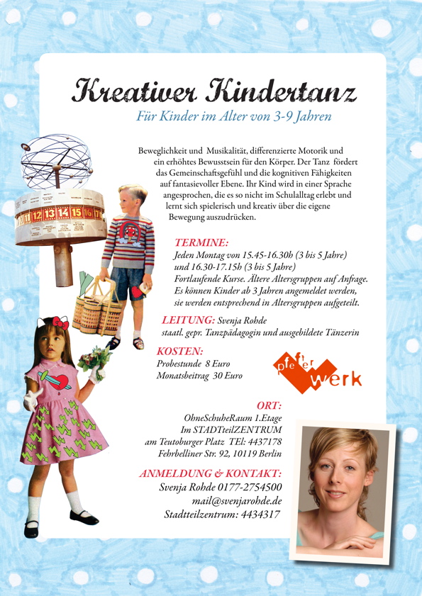 Die Einteilung meines Unterrichts geschieht nach Altersstufen, es gibt Kurse für 3-5 Jährige, 5-7 Jährige, 7-9 Jährige. Ich unterrichte mehrere verschiedene Kurse in Berlin: MONTAG 16.00h- 16.45h ab 3 Jahre16.45h-17.30h ab 4-5 Jahre Ort: Stadtteilzentrum am Teutoburger Platz, Fehrbelliner Str. 92 10119 Berlin MITTWOCH15.45h-16.30h ab 4 Jahre16.30h-17.15h 5-7 Jahre Ort: Nachbarschaftshaus Lietzensee Herbartstr. 25,14057 Berlin Tel: 030-303065-0 Momentan finden leider keine Kurse statt, da ich mich bis Ende 2018 in Elternzeit befinde!